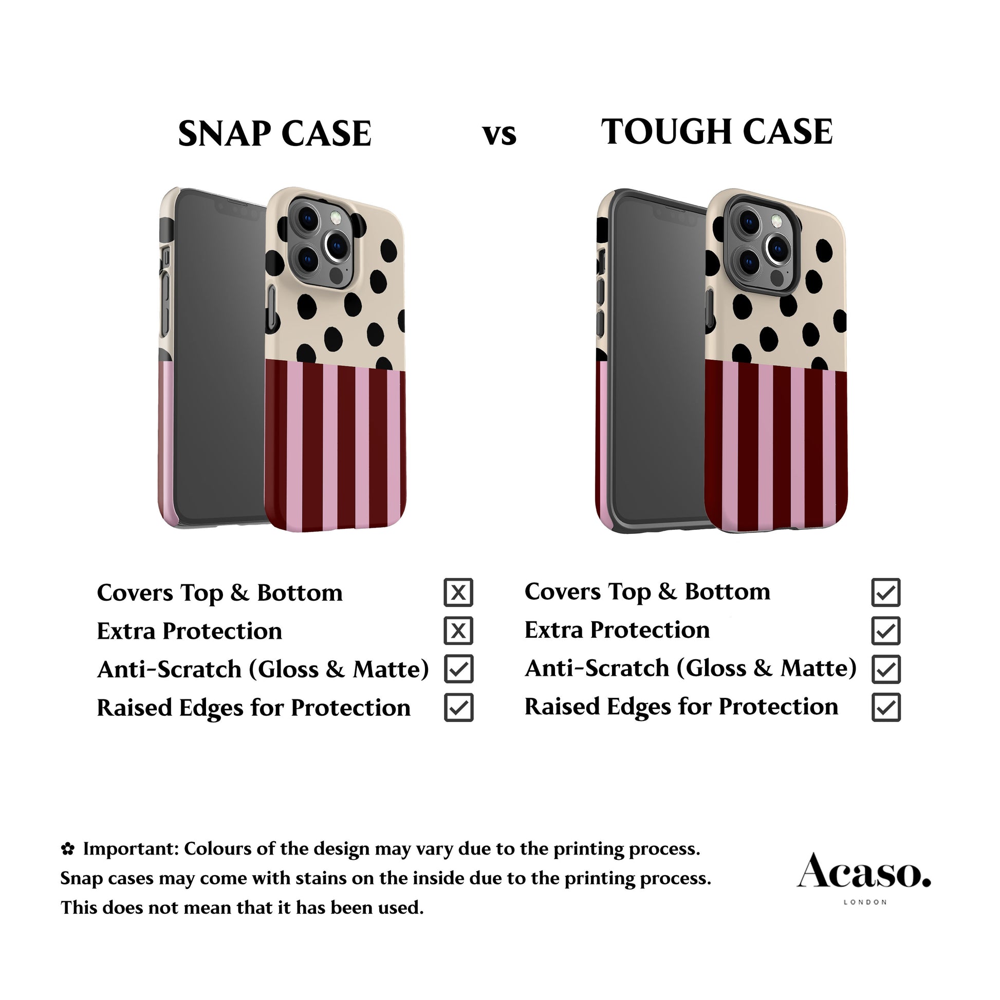 ⚠️ IMPORTANT: Colours of the design will vary: Because of the heat-based printing process, certain colours, including pastel, vibrant and dark colours, may vary from one print to another. This means that even if we were to attempt a replacement or adjustment, the same issue might still occur. Some colour issues to expect: Light Blue turning into almost White; Dark Brown turning into Black; Pastel Pink turning into Bright Pink. ❗Snap cases may come with small stains on the inside due to the printing process. This does not mean that it has been used. No refund will be process for these.
